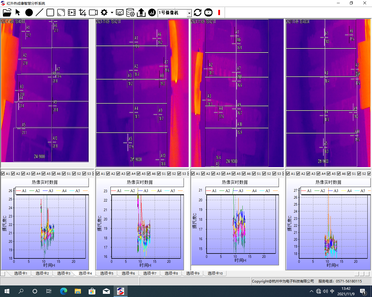 發(fā)電機碳刷在線監(jiān)測系統(tǒng)軟件預(yù)先使用多邊形區(qū)域測溫工具將重點部位框選出來,區(qū)域內(nèi)最高點溫數(shù)值及位置實時顯示,以實現(xiàn)重點部位重點監(jiān)控的目的。系統(tǒng)軟件所配置的點、線、多邊形測溫工具所框選的測溫區(qū)域都是相互獨立的,任意區(qū)域內(nèi)溫度、溫升達到其區(qū)域設(shè)置的閾值都能觸發(fā)高溫報警。