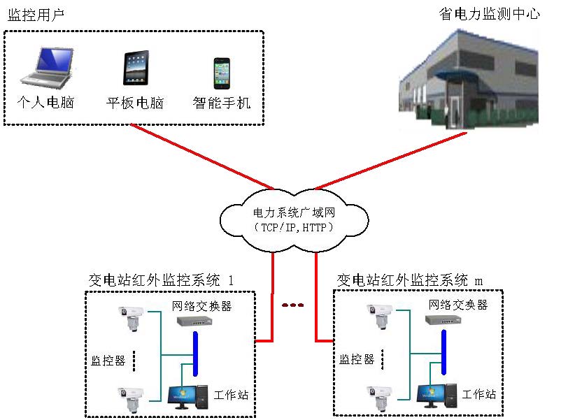 基于紅外熱成像的電力變電站遠(yuǎn)程監(jiān)控系統(tǒng)由全天候高性能雙通路監(jiān)控頭(紅外熱成像+CCD)與相應(yīng)的計(jì)算機(jī)網(wǎng)絡(luò)組成,系統(tǒng)采用了先進(jìn)的計(jì)算機(jī)壓縮技術(shù)與網(wǎng)絡(luò)傳輸技術(shù),只需通過(guò)RJ45標(biāo)準(zhǔn)以太網(wǎng)通訊接口,僅用“一根網(wǎng)線,一個(gè)IP地址”就可實(shí)現(xiàn)遠(yuǎn)程對(duì)雙視監(jiān)測(cè)器控制(焦距、溫度校正)、傳輸紅外和可見(jiàn)光視頻、傳輸測(cè)溫?cái)?shù)據(jù)、控制云臺(tái)。